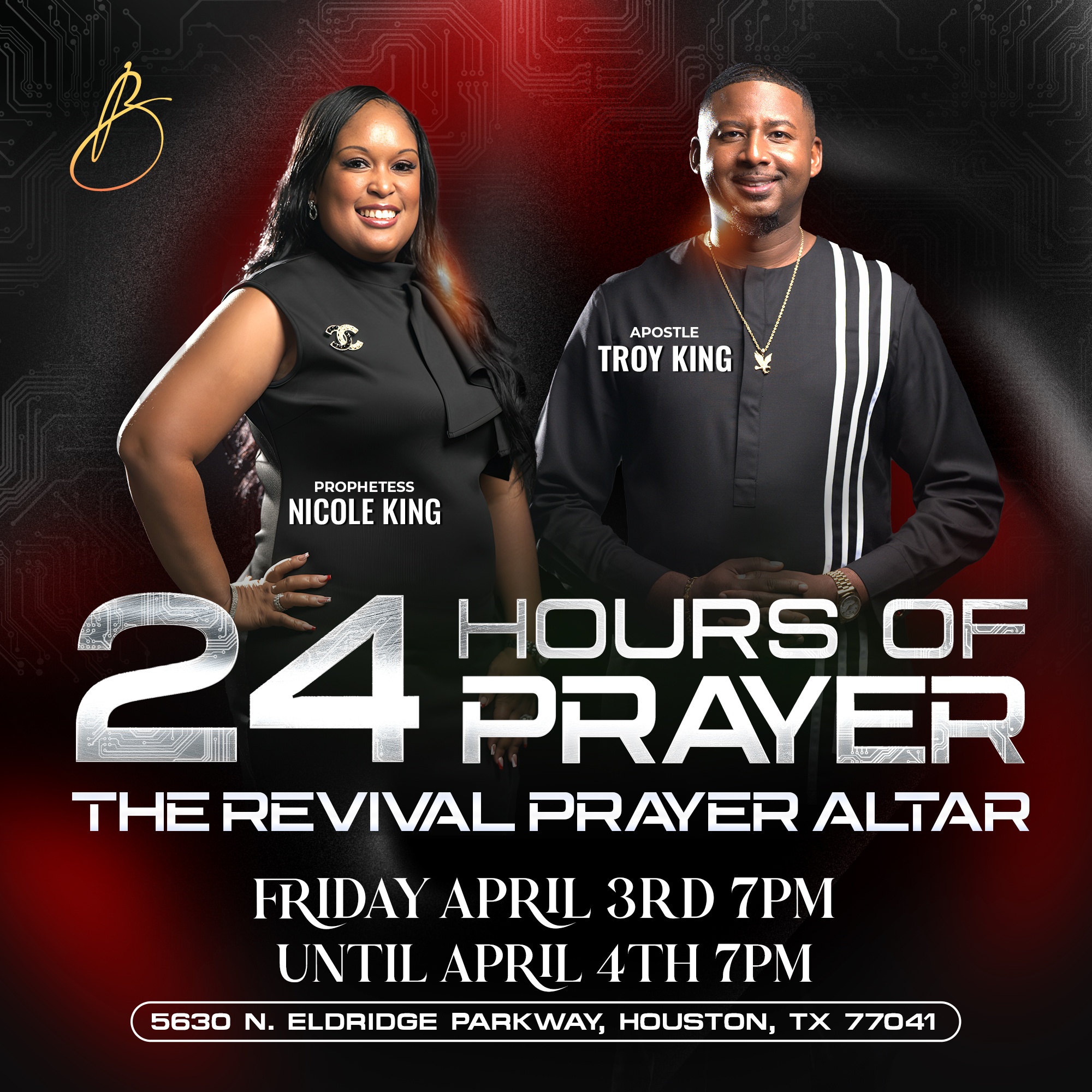 Step into a powerful 24-hour encounter with God at The Revival Prayer Altar. From Friday at 7PM to Saturday at 7PM, we will gather in continuous prayer, worship, and prophetic impartation, pressing into a deeper move of the Holy Spirit. This is more than an event, it’s a divine appointment to be refreshed, reignited, and transformed. Come expecting breakthrough, revival fire, and a fresh encounter with God.
